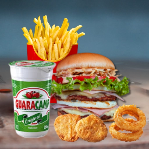 1 X tudo + batata frita + 2 nuggets + 2 cebola empanada + 1 Guaracamp